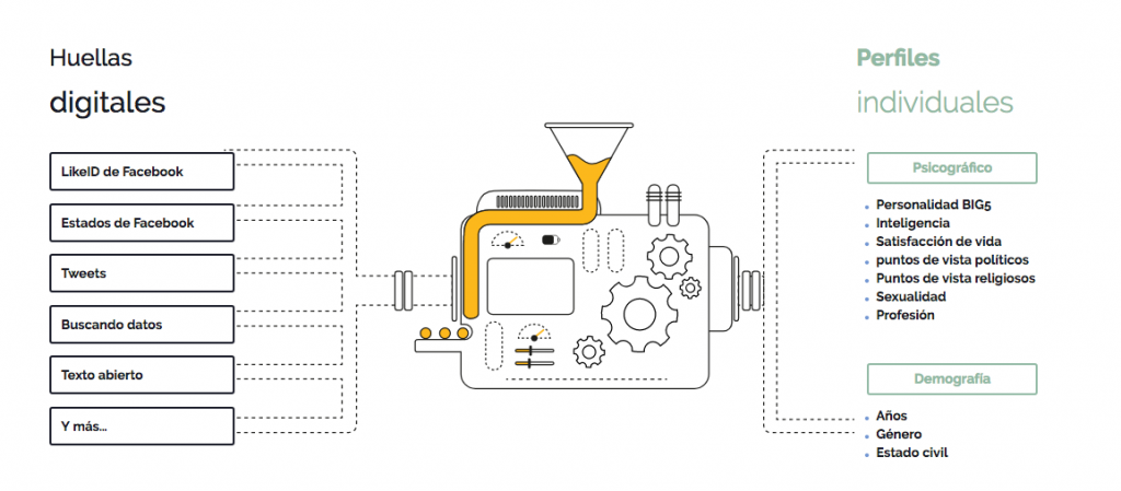 La Universidad de Cambridge desarrolló una herramienta que predice un perfil psicodemográfico a partir de los rastros digitales de comportamiento del usuario. Revela como puede ser percibido por otros en línea y proporciona información detallada sobre su personalidad, inteligencia, satisfacción de vida y más.